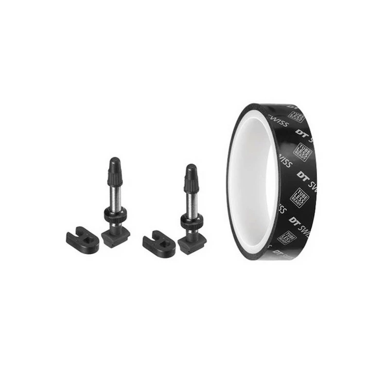 Kit tubeless per Mountain Bike originale DT Swiss comprensivo di valvole tubelss da 32mm e nastro tubeless da 10m di lunghezza e diverse misure di larghezza: 37mm, 32mm e 25mm