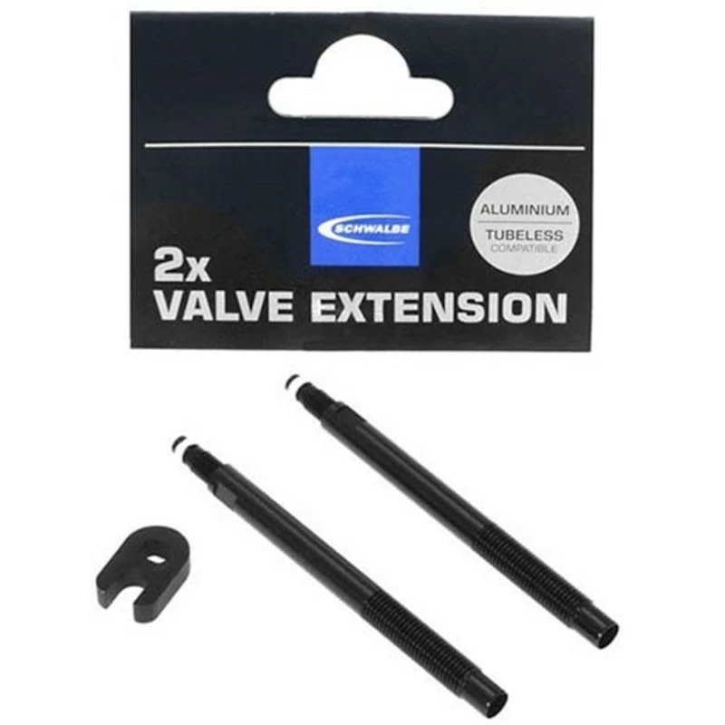 Prolunga Schwalbe in alluminio da 65mm per l’allungamento della valvola, confezione composta da 2 valvole e dall’attrezzo di smontaggio