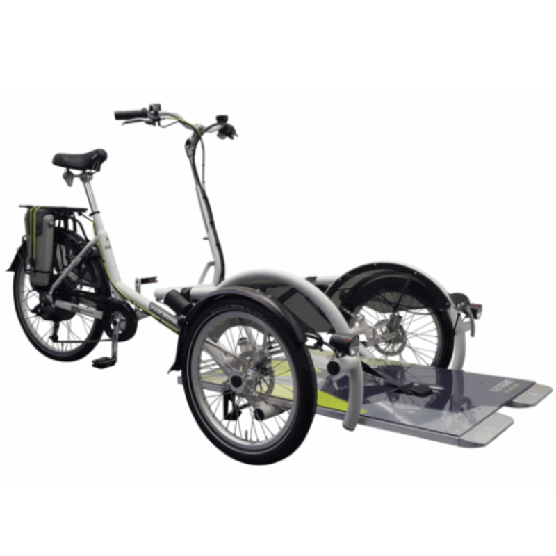 La VeloPlus è progettata per il trasporto di persone in sedia a rotelle; il passeggero può essere trasportato facilmente sul pianale della bicicletta senza dover essere sollevato in alcun modo.